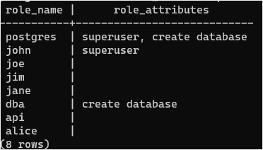 postgres=#Second, use the \du to list all user accounts (or roles) in the current PostgreSQL database server:
